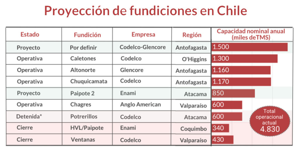 El mercado de fundiciones en Chile está cubierto por cinco plantas, en orden de capacidad nominal anual: Caletones (Codelco El Teniente), Altonorte (Glencore), Chuquicamata (Codelco), Chagres (Anglo American) y Potrerillos (Codelco Salvador), según Plusmining. De estas, Potrerillos está detenida por un accidente en una chimenea ocurrido en julio de este año.