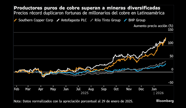 En conjunto, ambos multimillonarios generaron US$64.000 millones en nueva riqueza en el último año gracias a los precios récord del cobre. Solo este mes, las acciones de Southern Copper, con sede en Phoenix, subieron cerca de 40% y las de Antofagasta, casi 17%.